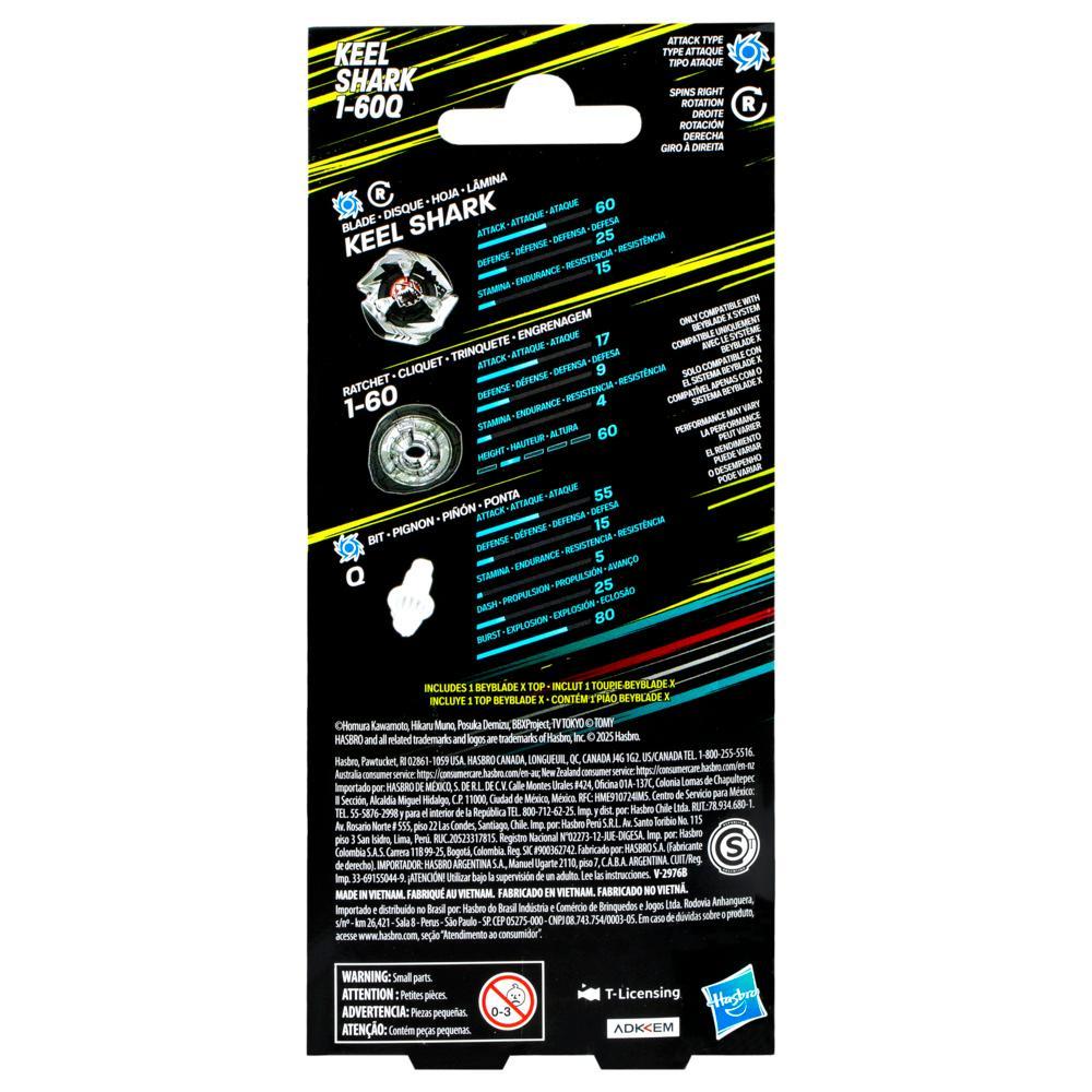 Experience the thrill of the next generation of Beyblade stadiums, launchers and tops: Beyblade X with the Beyblade X Keel Shark 1-60Q Booster Pack Set which includes 1 right-spinning Attack Type top (Beystadium and launcher required, sold separately). Launch right into battle or reconfigure the interchangeable blade, ratchet, and bit of this Booster Pack with those of other Beyblade X tops (sold separately) to create your own unsurpassable top. Beyblade X features the X-Celerator Gear System innovation to level-up your game. When the gear of a Beyblade X top engages the rail of the Beystadium arena, it can super-accelerate into an Xtreme Dash rocketing it around the stadium for crushing collisions and epic bursts. Bladers launch their tops into fierce clashes against their opponent??s scoring points with each confrontation ?C first to score 4 points wins. Hasbro Beyblade toys with authentic Takara Tomy die-cast metal tops make great kids gifts for boys and girls ages 8 and up.