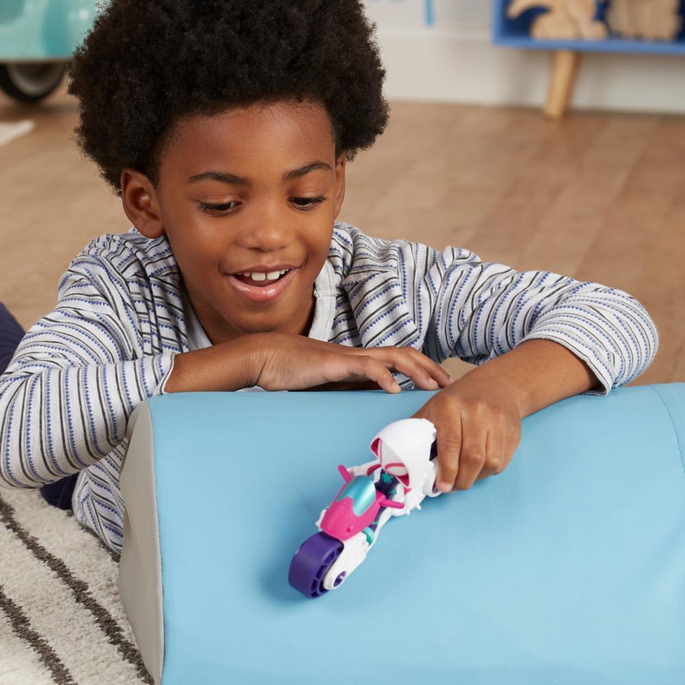 It??s Spidey time! This Spidey and His Amazing Friends toy comes with a Ghost-Spider figure and a toy motorcycle for action-packed play. The 4-inch figure can really ride the bike, so preschoolers can imagine zooming into super hero adventures with Ghost-Spider. With this preschool Marvel Super Hero figure and vehicle set, fun is just a ride away! This Spidey toy set makes a great holiday or birthday gift for kids ages 3 and up who love the adventures of Spidey, Miles Morales: Spider-Man, Ghost-Spider, and all their friends and foes! Copyright MARVEL. All trademarks and registered trademarks are the property of their respective owners. Hasbro and all related terms are trademarks of Hasbro.