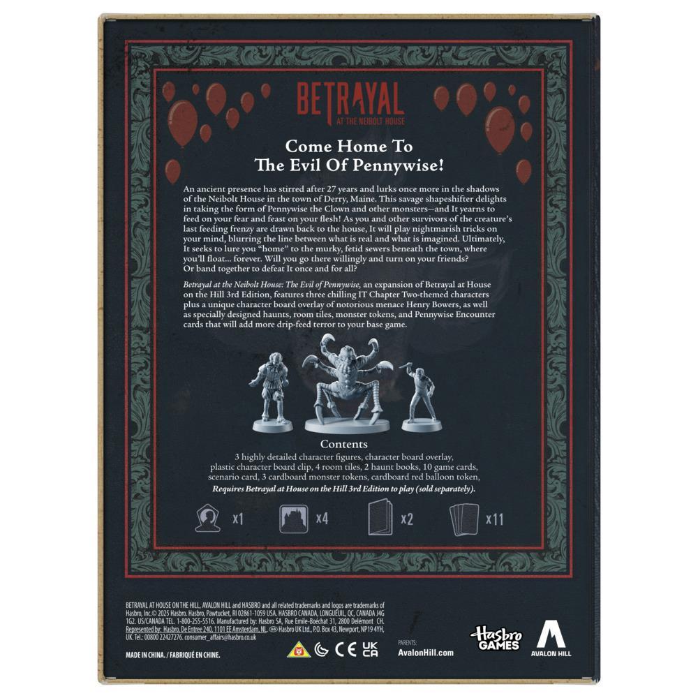 You??re with a group of friends who survived It??s last feeding frenzy in the town of Derry when you were kids. Now, It has stirred again after 27 years, and you??ve been drawn back to the Neibolt House to confront the savage shapeshifter. As you explore the house and experience nightmarish events, will you turn on your friends? Or will you band together to beat it once and for all? Inspired by the It Chapter Two movie based on Stephen King??s novel, Betrayal at the Neibolt House: The Evil of Pennywise pack is a horror game of 5 terrifying haunts. Gather for a night of monsters, murder, and miniatures in this immersive cooperative board game for 3-6 players, ages 17+! (Betrayal at House on the Hill expansions require Betrayal at HOTH 3rd Ed. to play, sold separately).