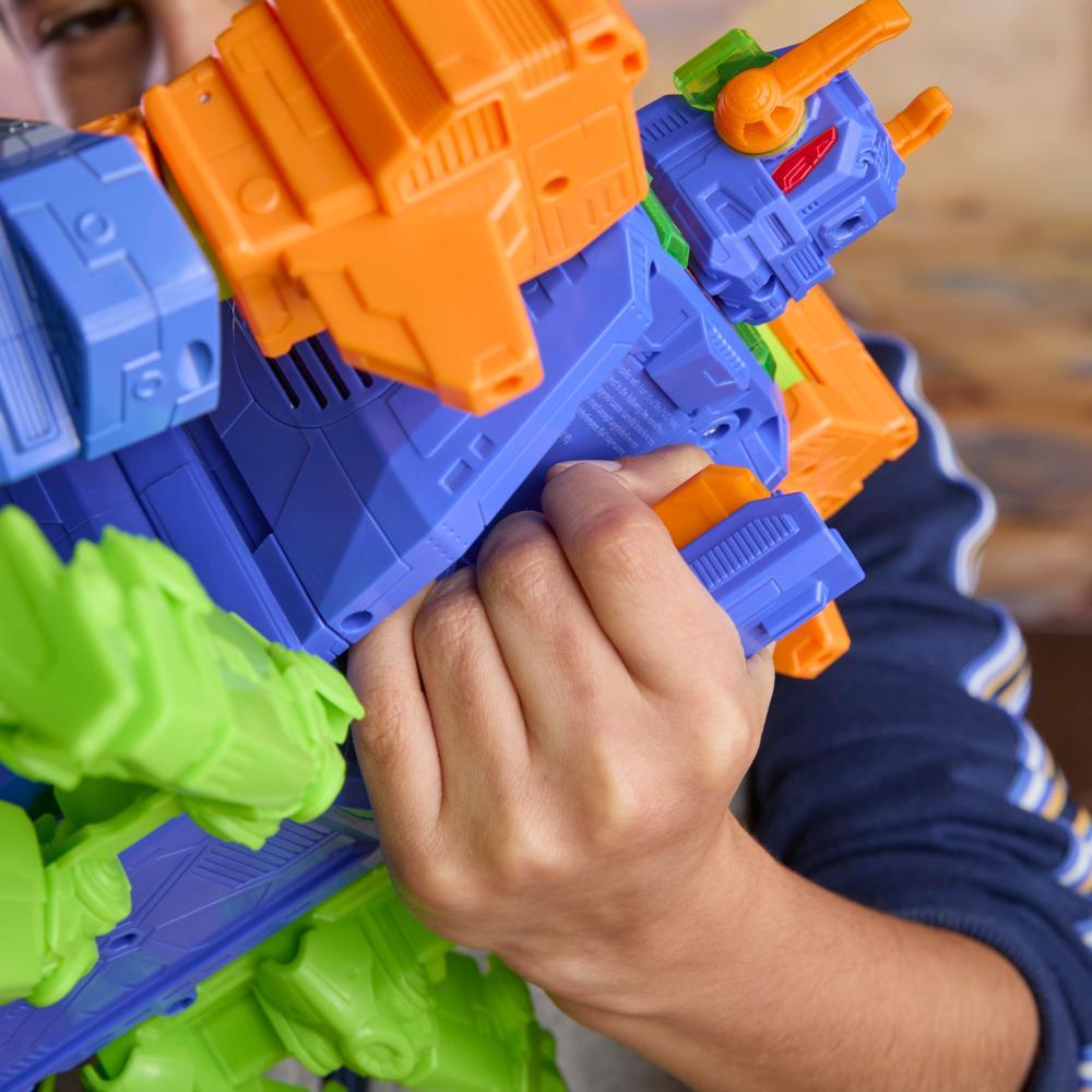? INTERACTIVE BATTLE FEATURES: The Transformers figure has a spinning buzzsaw blade arm, a working claw arm, and fold-out battle stations in his chest and legs for Cyber Changers figures